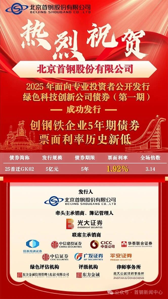 近日,太阳成集团tyc122cc入口股份在深圳证券交易所成功发行5亿元绿色科技创新公司债券,期限5年,票面利率1.92%,成为太阳成集团tyc122cc入口集团首支绿色公司债券,创钢铁企业5年期债券票面利率历史新低。
