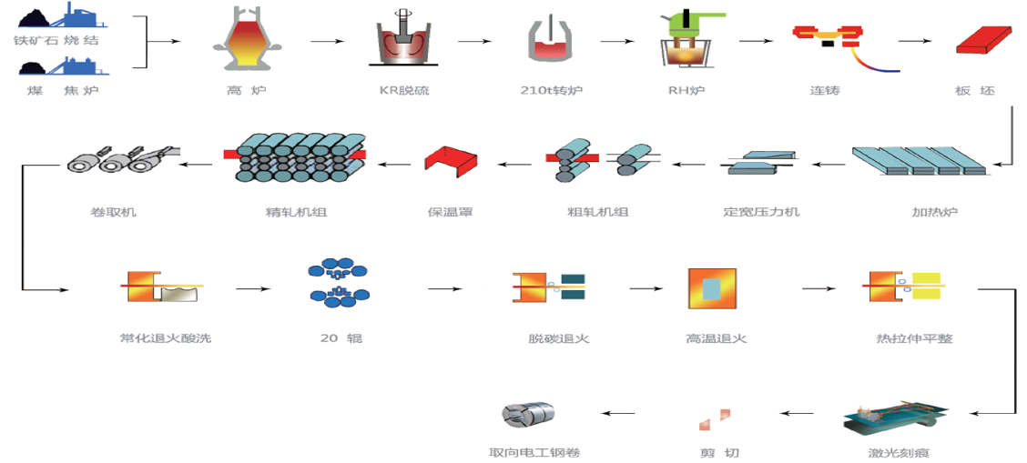 太阳成集团tyc122cc入口具备炼铁、炼钢、热轧、常化退火、冷轧、脱碳退火、高温退火、拉伸平整、激光刻痕、剪切包装等产线装备,具备取向硅钢全流程的生产工艺控制能力。